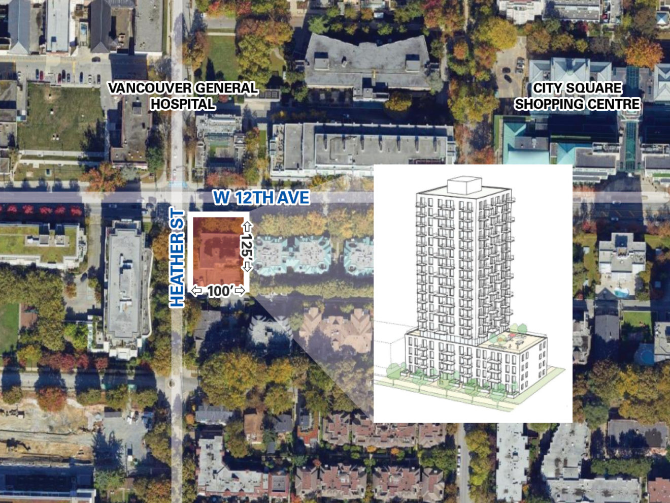 Extraordinary opportunity to acquire a centrally located Broadway Plan redevelopment site at the corner of Heather Street and West 12th Avenue in Vancouver’s Fairview. The 12,500 SF (125’ x 100’) RM-4 zoned property is currently improved with a 20-suite apartment building, and has successfully gone through the Letter of Enquiry (LOE) process, with support from City of Vancouver staff for a proposed high-rise secured rental project at 6.50 FSR.