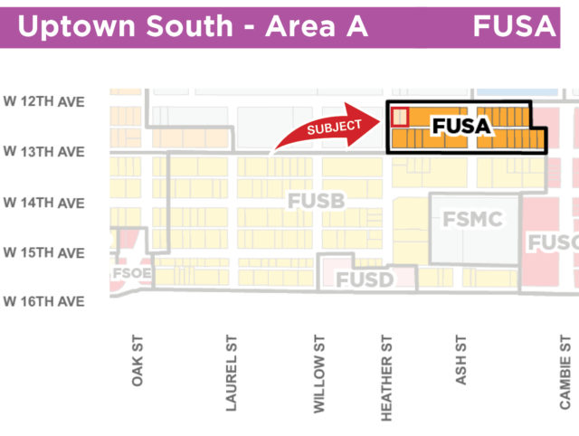 The property is within the Uptown South – Area A (FUSA) of the Broadway Plan. FUSA allows rezoning for secured rental projects up to 20-storeys and 6.5 FSR, with 20% of residential floor space secured at below-market rents.