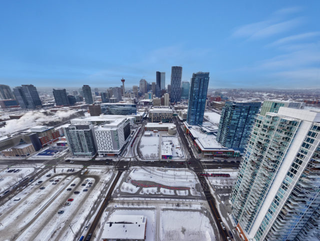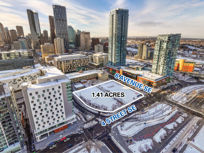 The property is prominently located on the southwest corner of 6 Avenue SE and 4 Street SE in Calgary’s East Village neighbourhood, just outside the downtown central business district and two blocks south of the Bow River and Calgary Riverwalk.