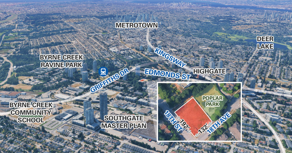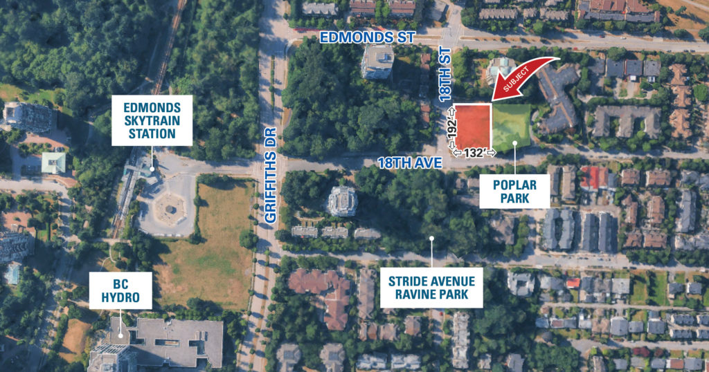 Located in Burnaby’s Edmonds neighbourhood, the site commands a prominent position along 18th Avenue and 18th Street, just a short walk from Edmonds SkyTrain Station. This well-connected area provides seamless access to public transit, major routes, and daily amenities, creating an ideal backdrop for residential development.