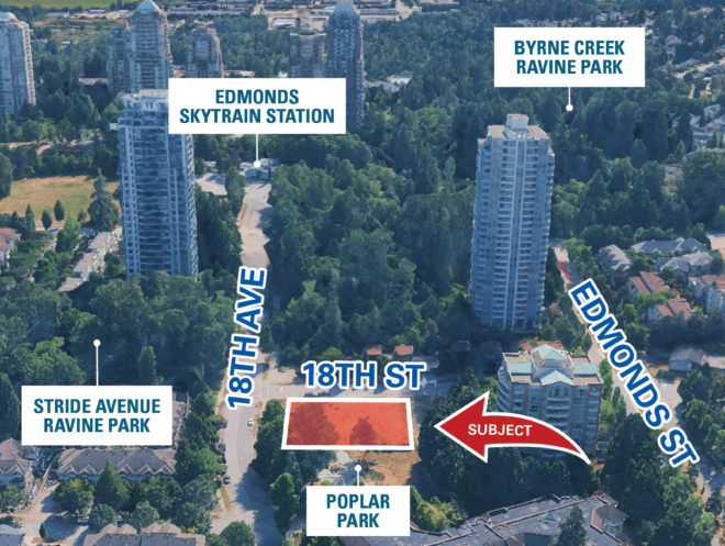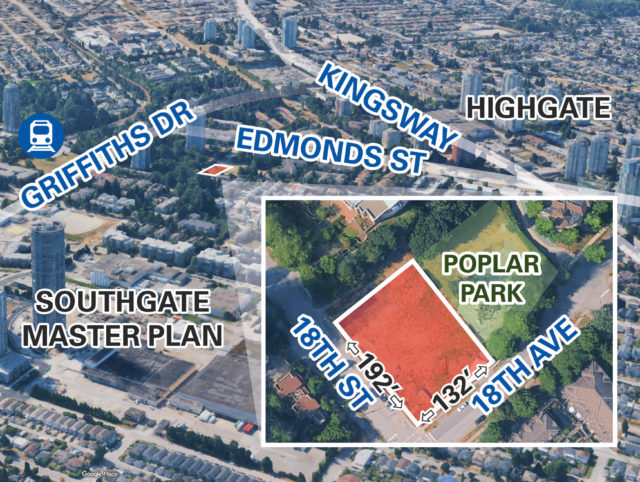 Located in Burnaby’s Edmonds neighbourhood, the site commands a prominent position along 18th Avenue and 18th Street, just a short walk from Edmonds SkyTrain Station. This well-connected area provides seamless access to public transit, major routes, and daily amenities, creating an ideal backdrop for residential development.