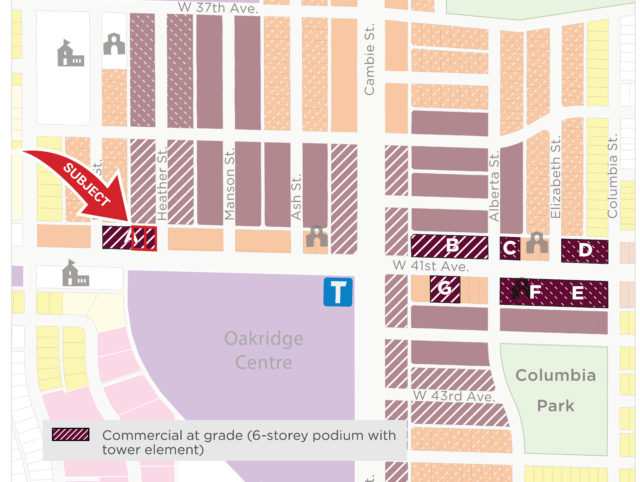 The property is well positioned within the vibrant and rapidly densifying Oakridge neighbourhood in Vancouver’s Westside. The site falls within the Oakridge Municipal Town Centre, described by the City of Vancouver as one of 17 regionally-significant town centres across Metro Vancouver. This established area is rich in amenities and boasts numerous parks and schools in close proximity.