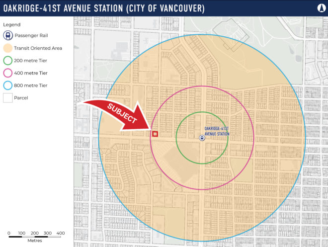 The site’s strategic location places it directly across from the massive Oakridge Park project (Oakridge Centre redevelopment) and approximately 300 m from the Oakridge-41st Avenue Station on the Canada Line. Upon completion, Oakridge Park will feature an 850,000 SF regional shopping centre, 700,000 SF of office space, a 100,000 SF civic centre, and a 9-acre publicly accessible park.