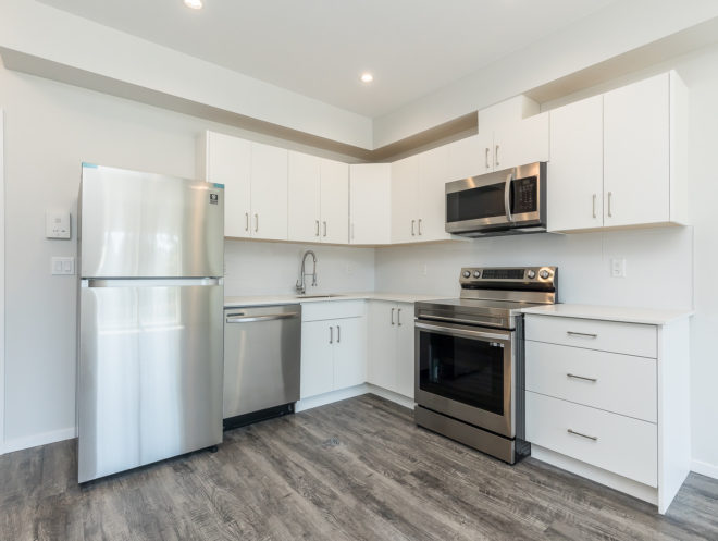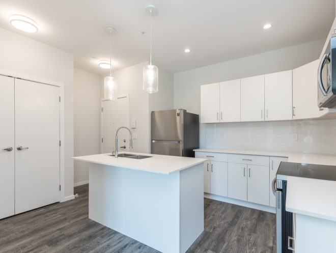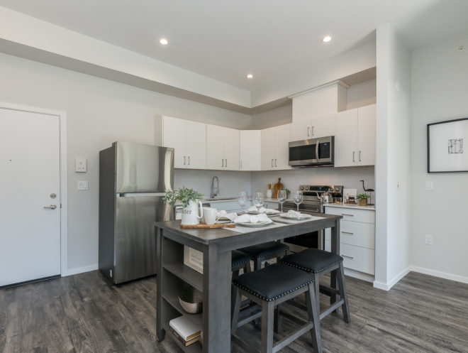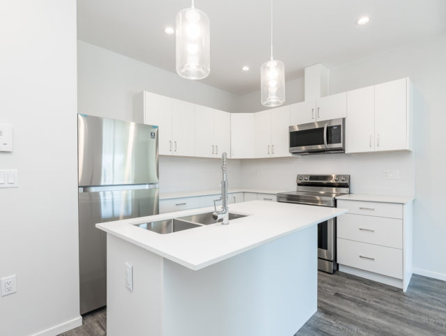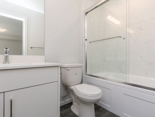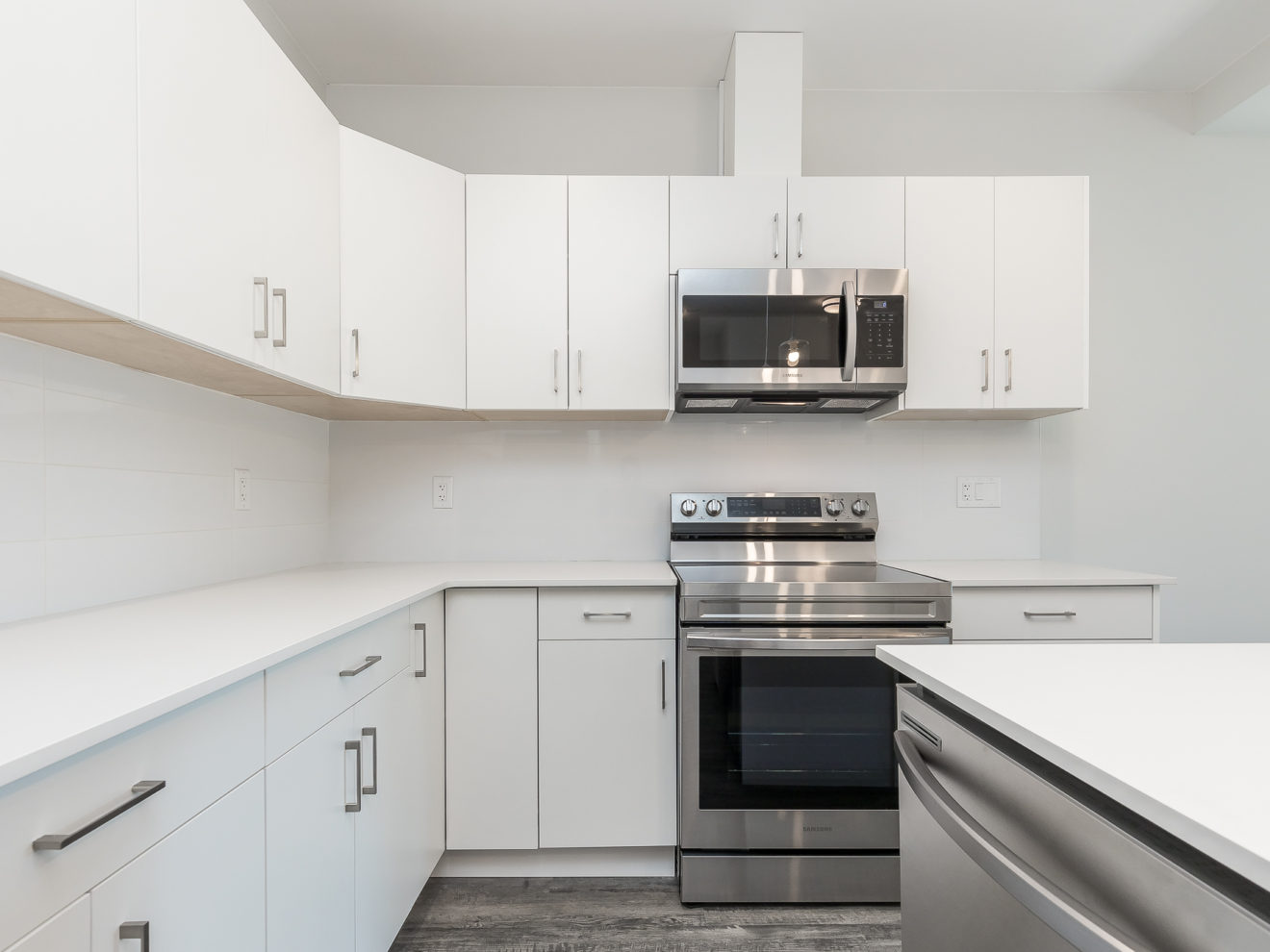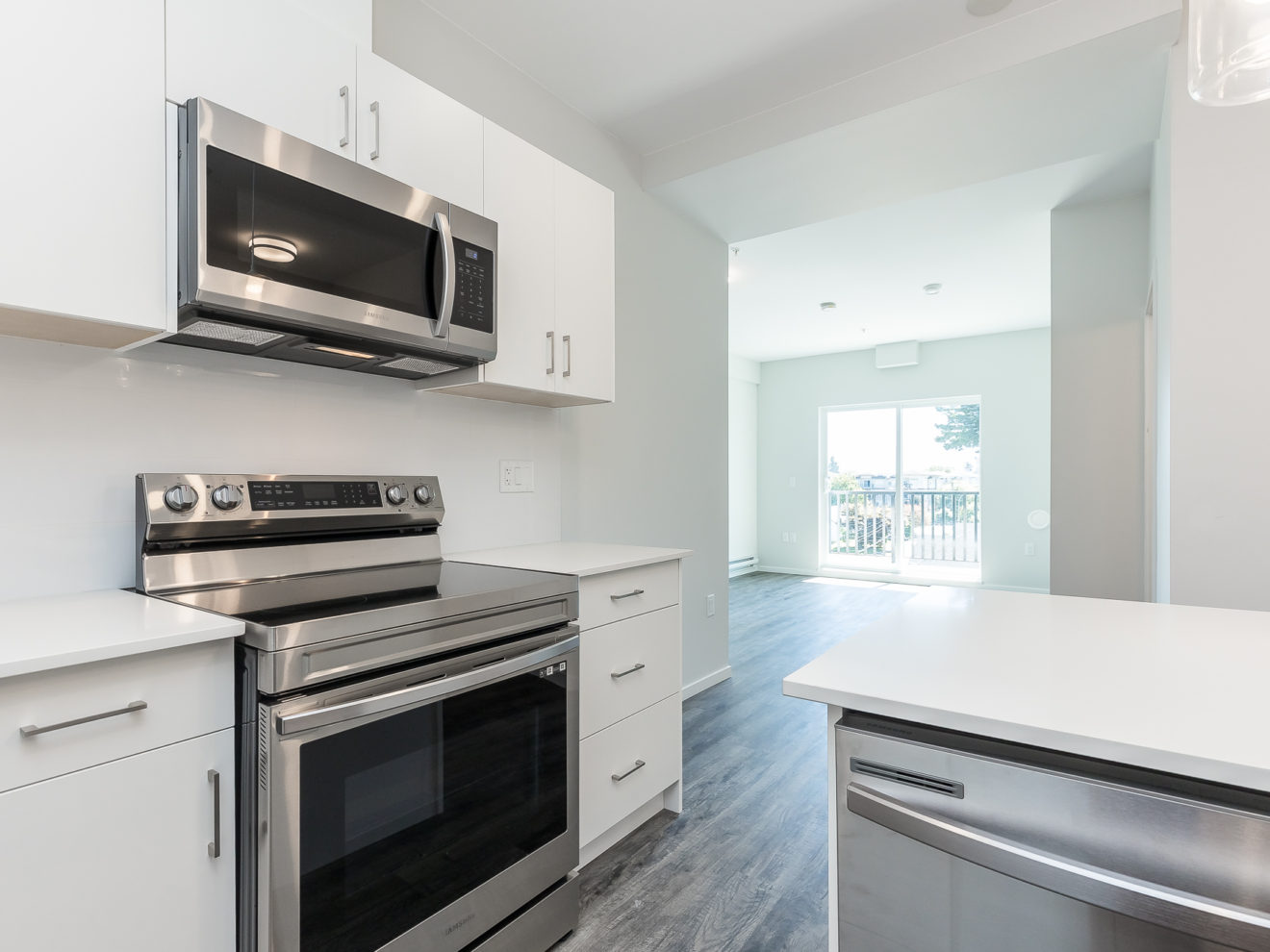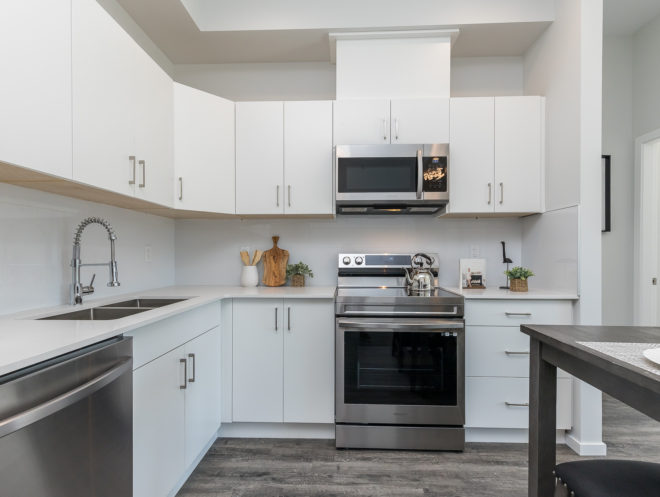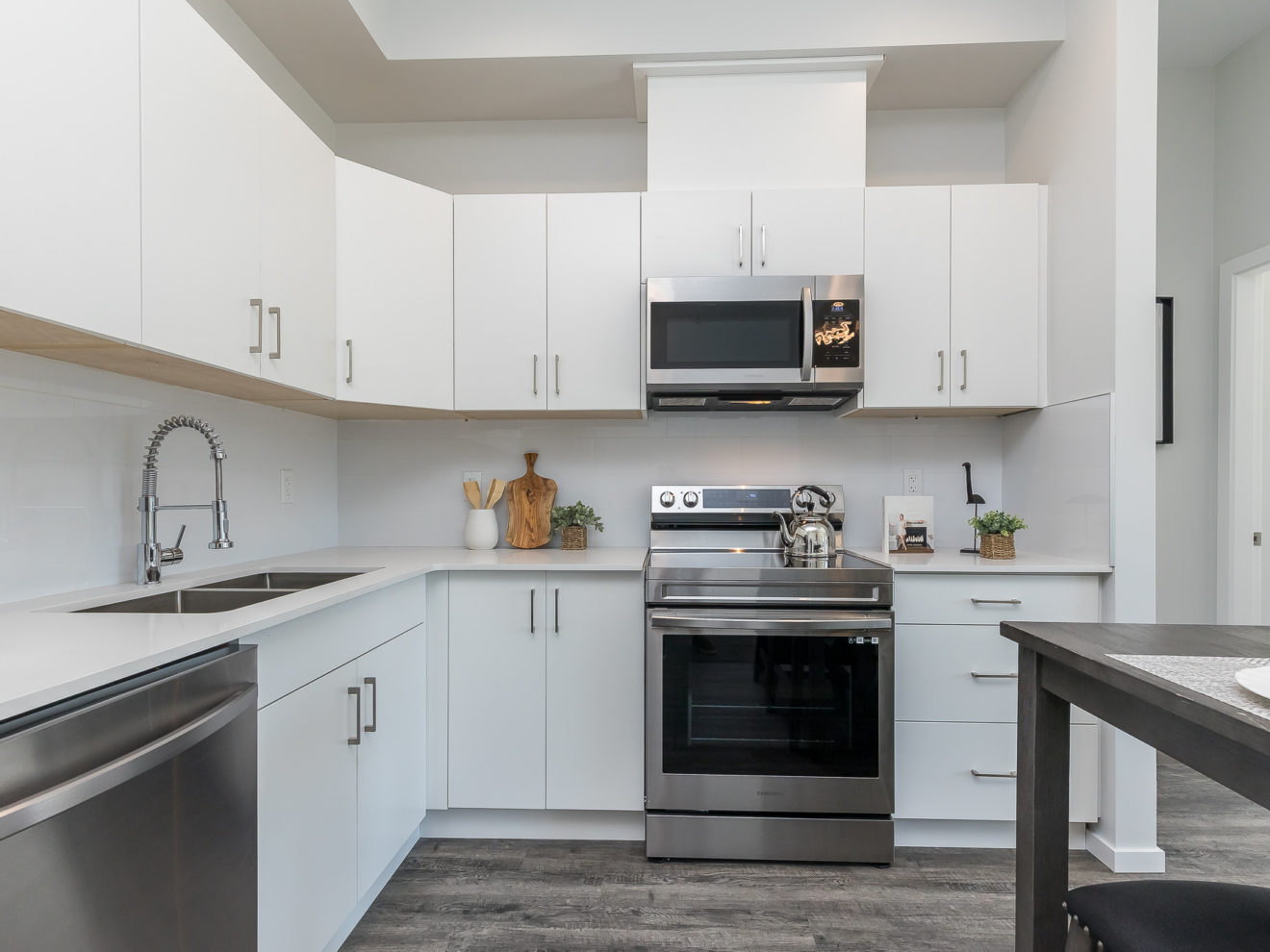 The Station at Mellard offers a mix of well-appointed one-, two-, and three-bedroom units. All suites feature modern finishes, including oversized windows, durable vinyl plank flooring, in-suite laundry facilities, and kitchens equipped with sleek stainless-steel appliances and quartz countertops. The spa-inspired bathrooms are spacious and include dual sinks for added luxury.