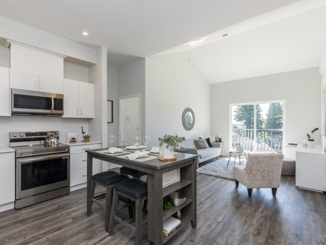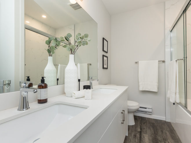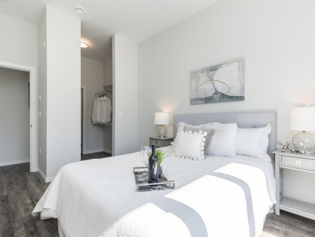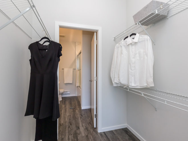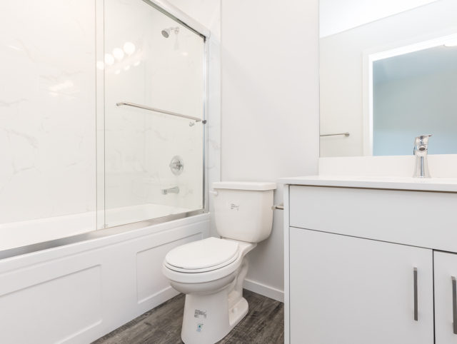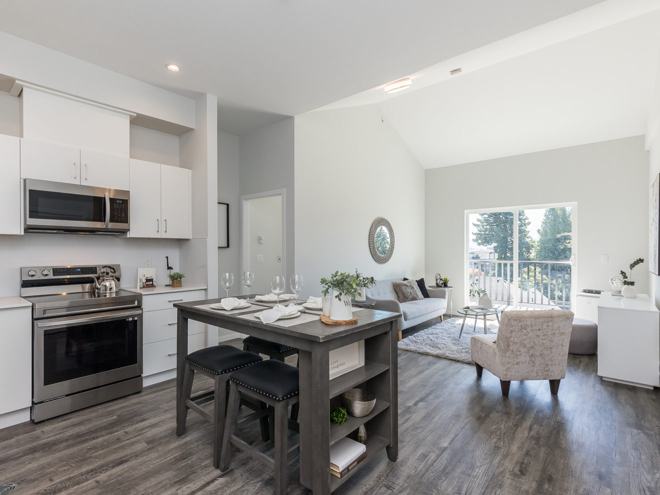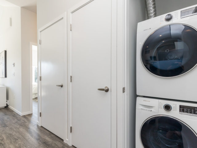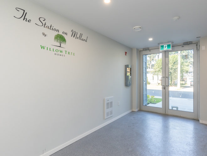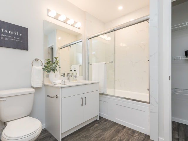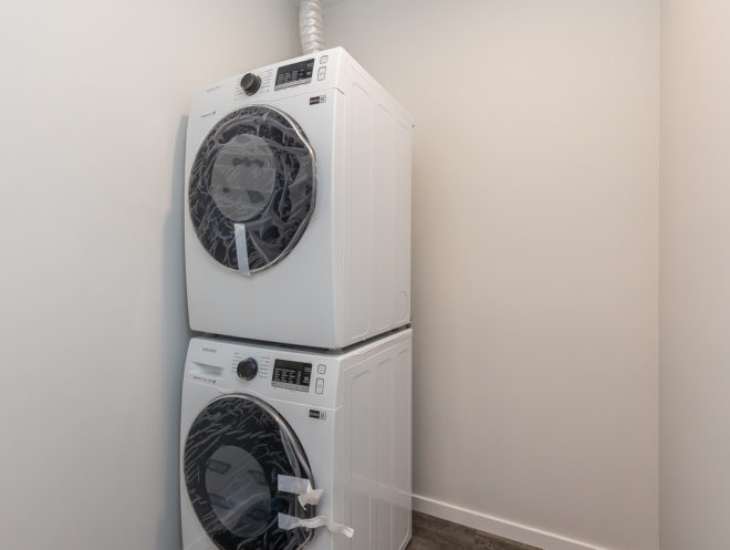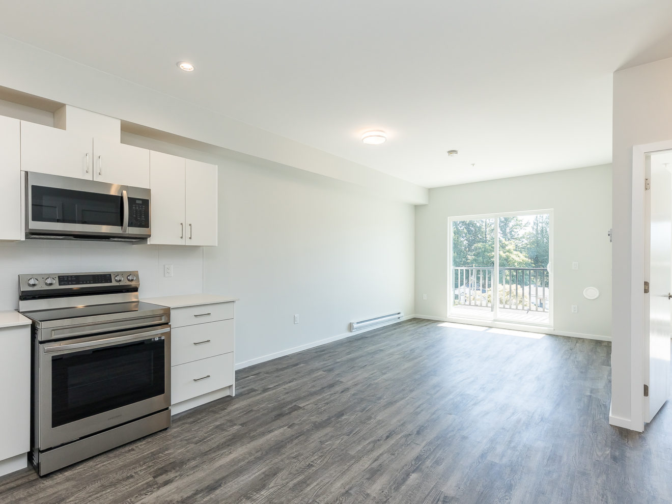 The Station at Mellard offers a mix of well-appointed one-, two-, and three-bedroom units. All suites feature modern finishes, including oversized windows, durable vinyl plank flooring, in-suite laundry facilities, and kitchens equipped with sleek stainless-steel appliances and quartz countertops. The spa-inspired bathrooms are spacious and include dual sinks for added luxury.