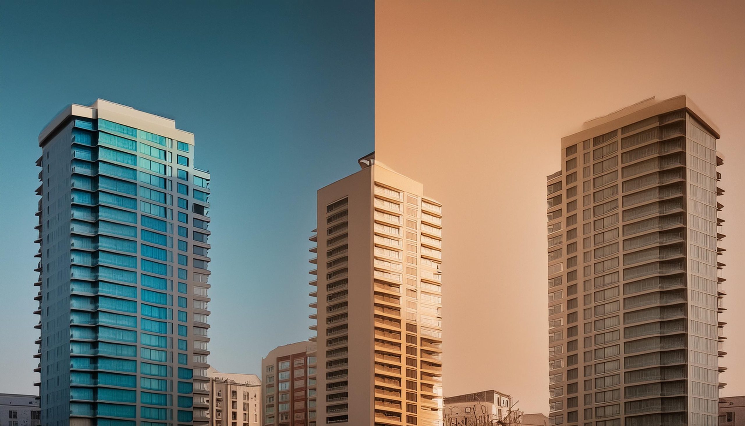 Firefly Detailed, new, beautiful apartment buildings, on a two tone background separated in the midd