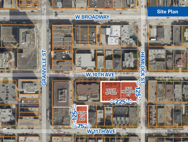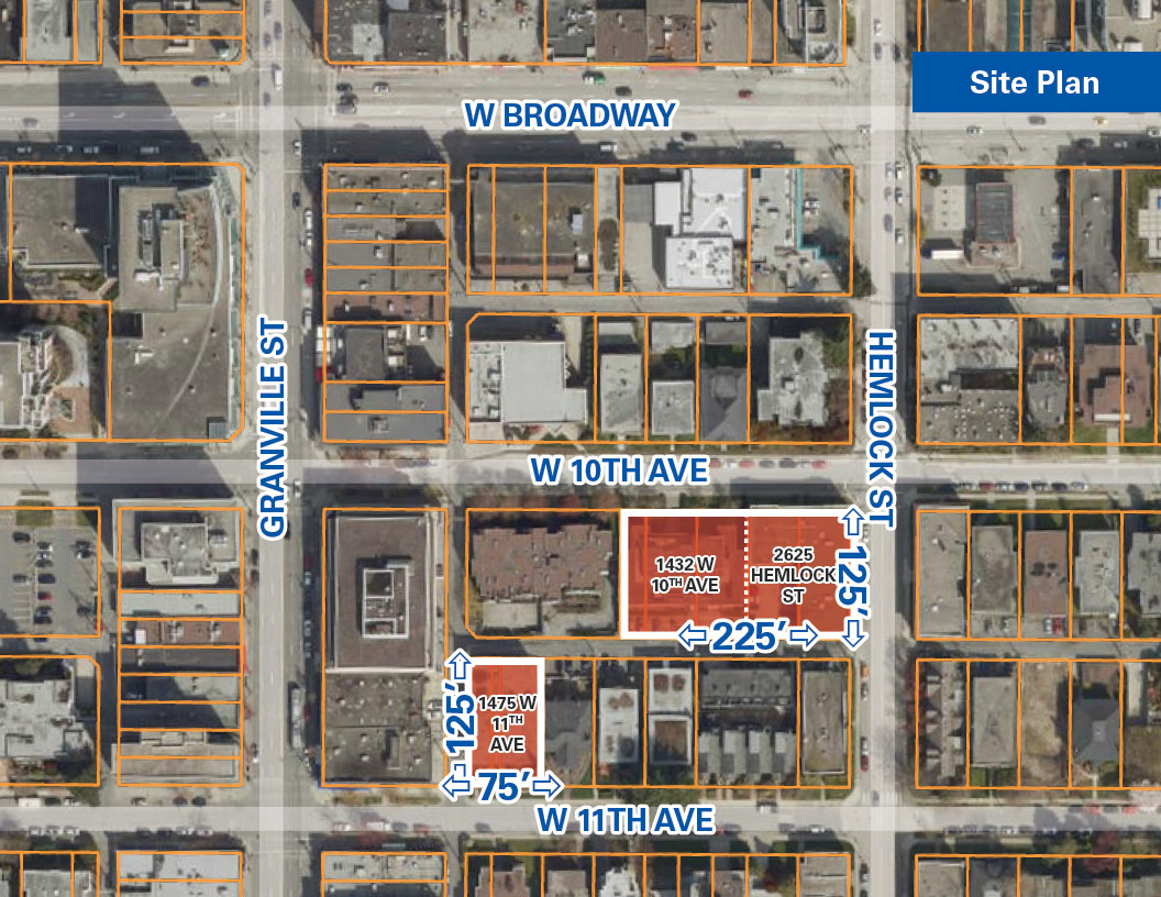 1475 W 11th Avenue is situated on a 75’ × 125’ (9,383 SF) corner property, while 2625 Hemlock Street and 1432 W 10th Avenue sit on a combined 28,147 SF of land with 225’ frontage stretching from the southwest corner of Hemlock Street and W 10th Avenue.
