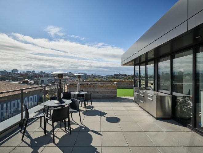 The benefits of LEED® Gold certification includes everything from substantial reductions in energy, water and maintenance costs to emphasizing human health and integrative building design. Other features include a living roof, superior glazing and super-adequate engineered mechanical systems. The living rooftop also has functional common areas including a patio, BBQ area and small workspace. Landscaping also incorporates green systems into LEED® Gold standards.