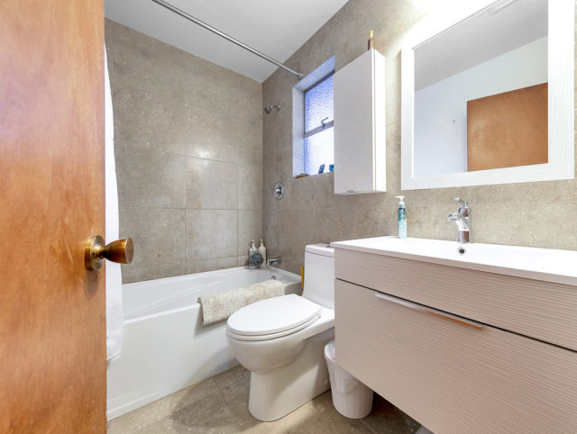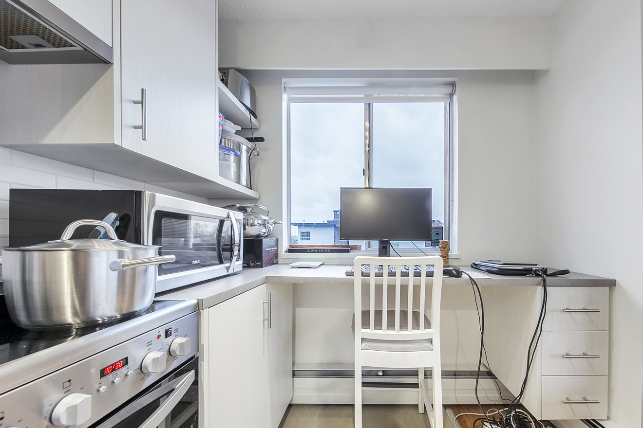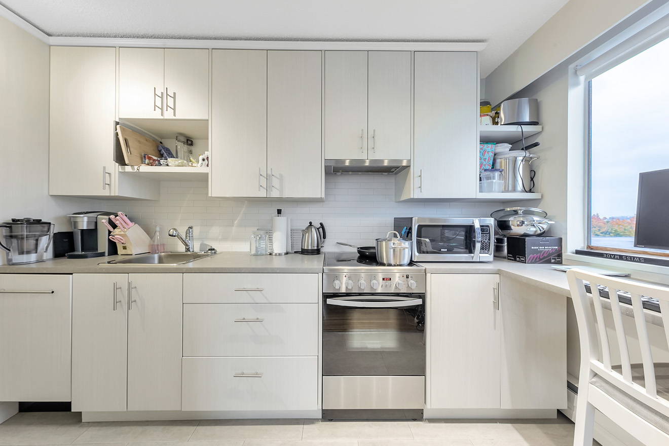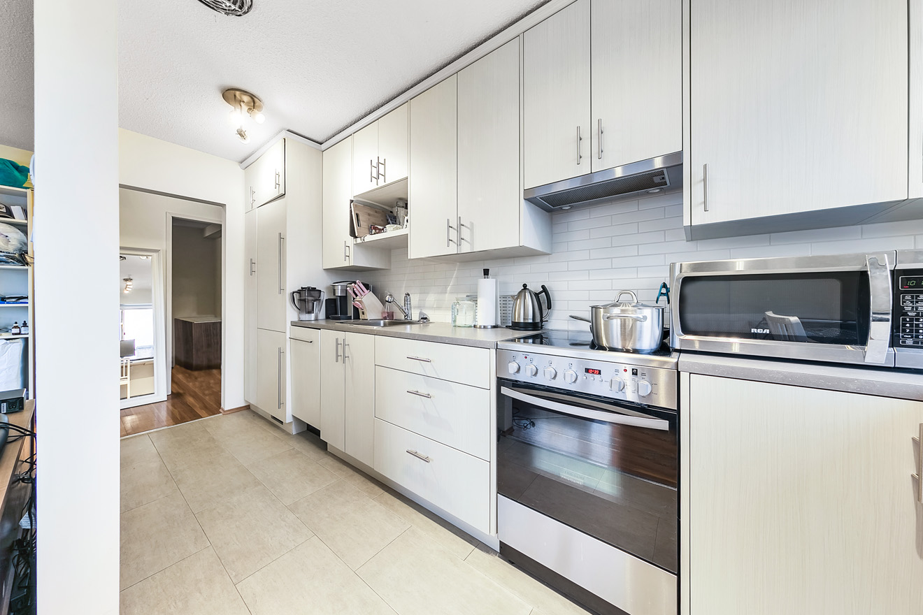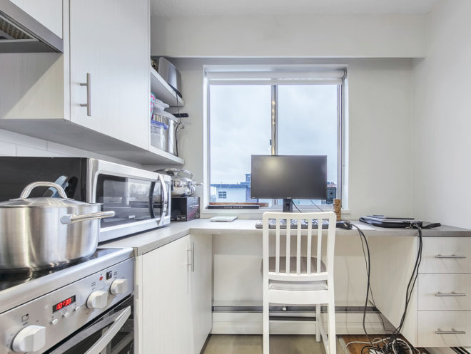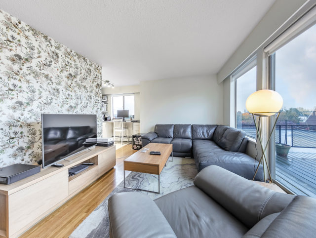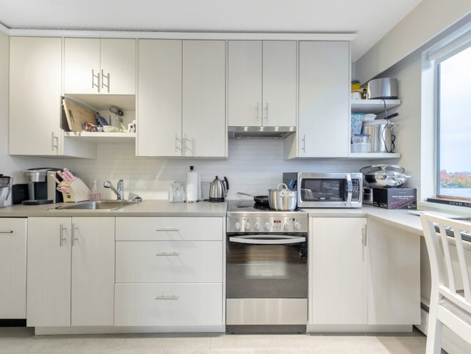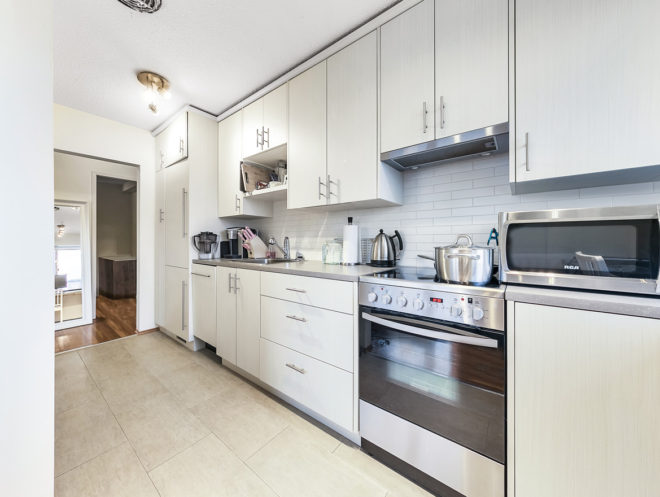 - Modern two-bedroom penthouse renovation featuring integrated fridge, stainless-steel range and a tech-desk nook in kitchen along with limestone tile in the bathroom. The large west-facing patio has been recently updated as well