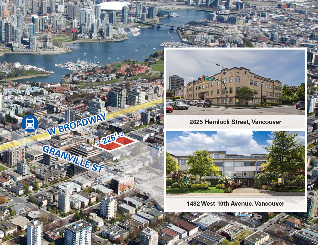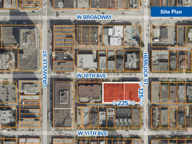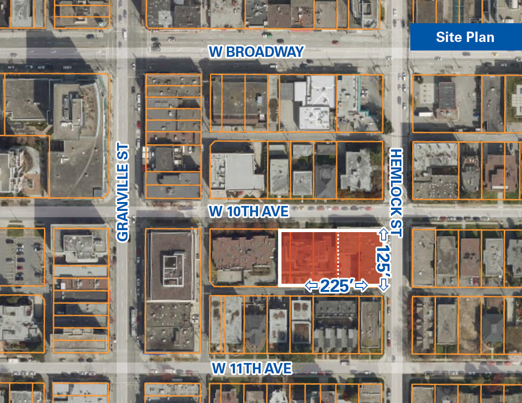 Stretching from the southwest corner of Hemlock Street and west along 10th Avenue, the combined 28,147 SF properties are located in a key arterial of the Broadway Plan with potential for high-density redevelopment up to 20 storeys.