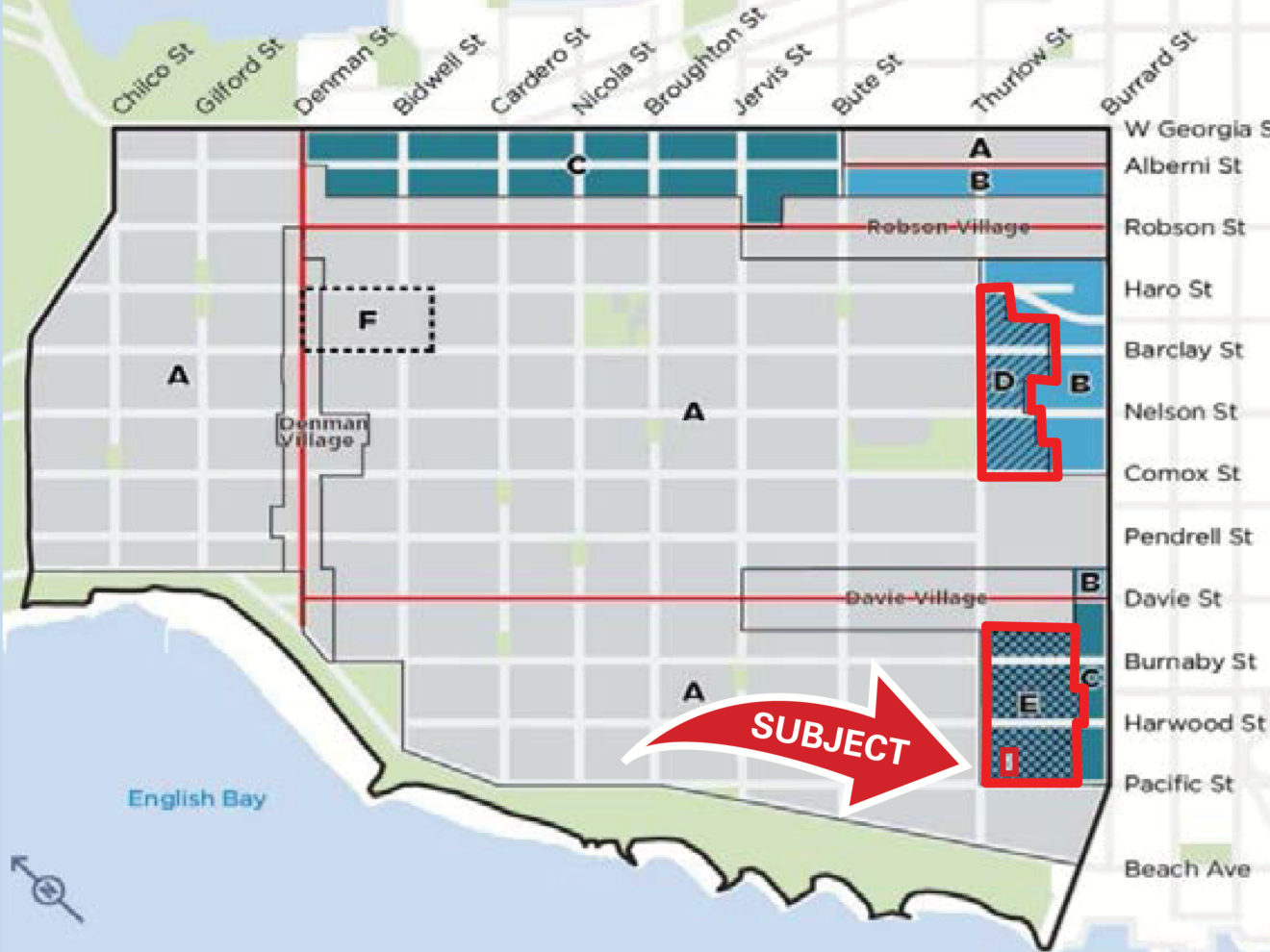 The subject property represents a rare opportunity to purchase a ~13,000 SF development site just west of the Burrard Street Bridge in Vancouver’s coveted Sunset Beach seaside community. The land is situated in “Area-E” of the newly established 100% Secured Rental and Below-Market Housing as an Alternative to Condo/Inclusionary Social Housing in the Burrard Corridor of the West End Community Plan. The property can also be rezoned under Area-G of the Burrard Corridor area in the West End Plan which supports heights up to 300 ft in condo/social housing form, subject to other design guidelines.