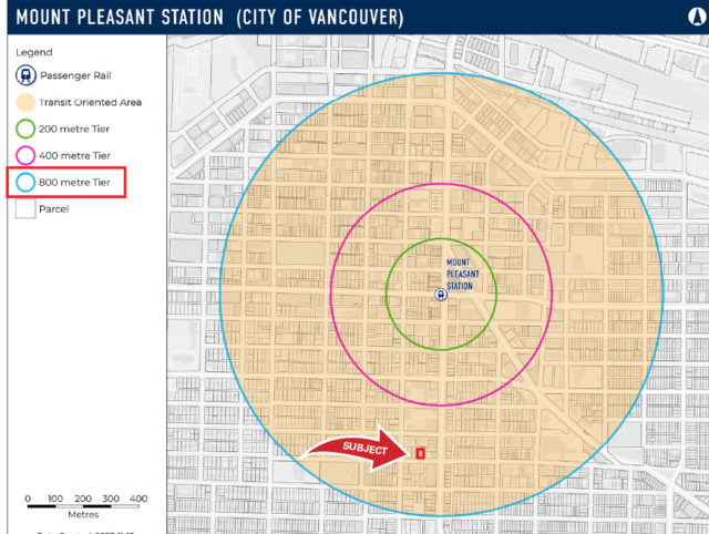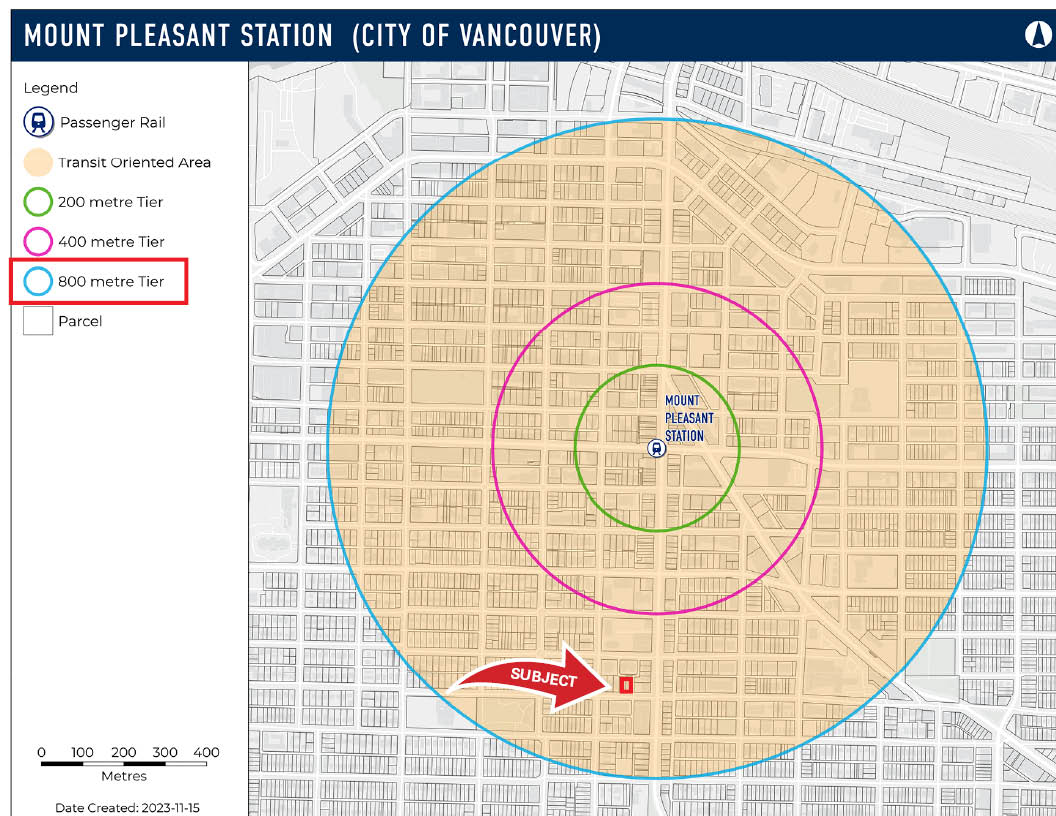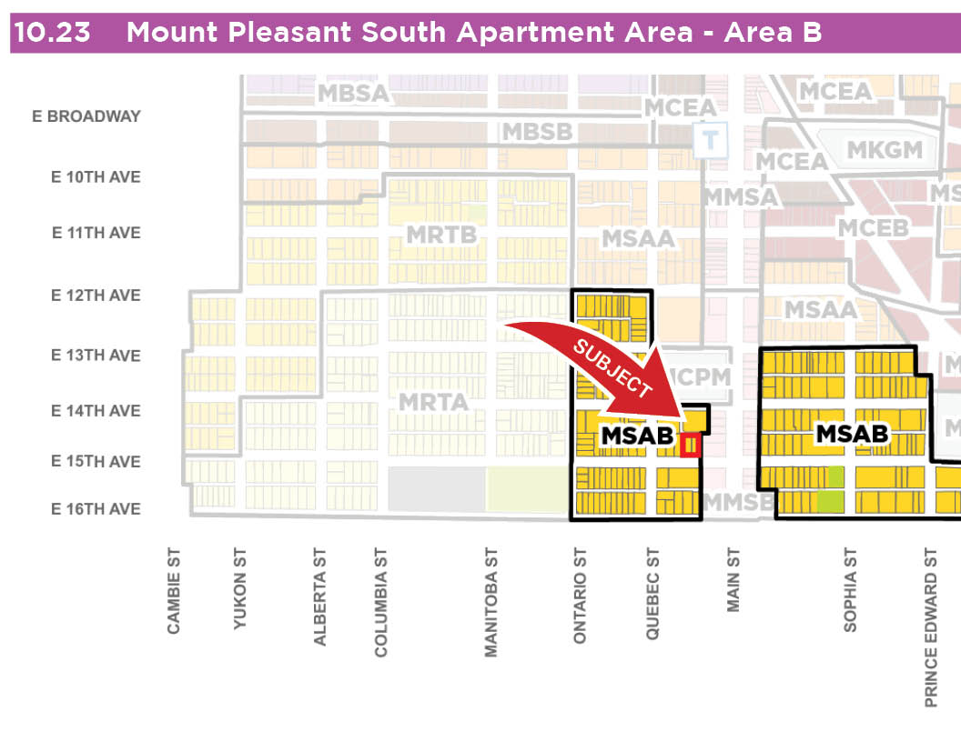 The property is located within Mount Pleasant South Apartment Areas – Area B – Residential Apartment Areas (MSAB) of the Broadway Plan and falls within Tier 3 of the Transit-Oriented Areas rezoning policy.